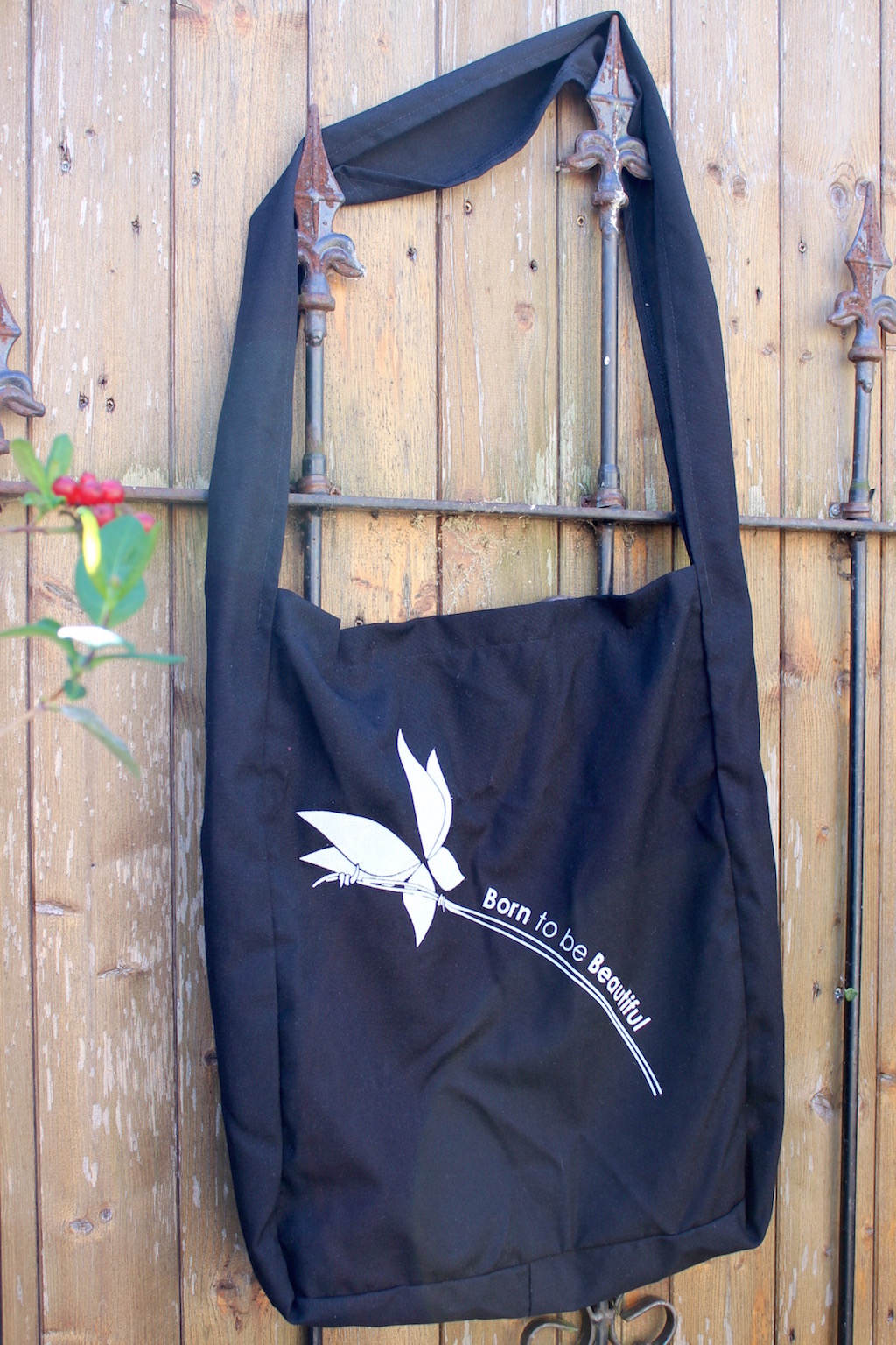 Black, canvas tote bag with a wide strap, with the B2BB butterfly printed on in white